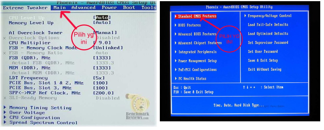 - kemudianpilih tab/menu “Standard CMOS Features”